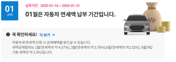 - 정부24(www.gov.kr)에서 **‘자동차세 연납’**을 검색하여 신청 가능합니다.